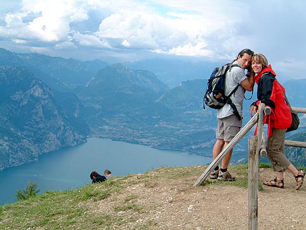 Monique und Swen an einem Aussichtspunkt auf dem Monte Baldo. Nach ca. 15 Minuten Fußweg vom Lift genossen wir die tolle Blicke auf den nördlichen Gardasee.