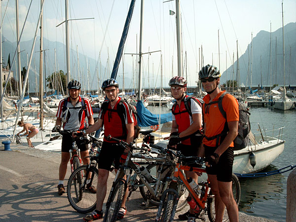 Geschafft! Am Hafen von Riva schossen wir unser Abschlussfoto. Nach knapp 500 Kilometern waren die Alpen überquert.