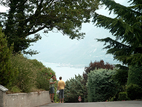 Ronny und ich auf dem Weg durch den Ort ins Schwimmbad, im Hintergrund der Gardasee sowie der Monte Baldo.