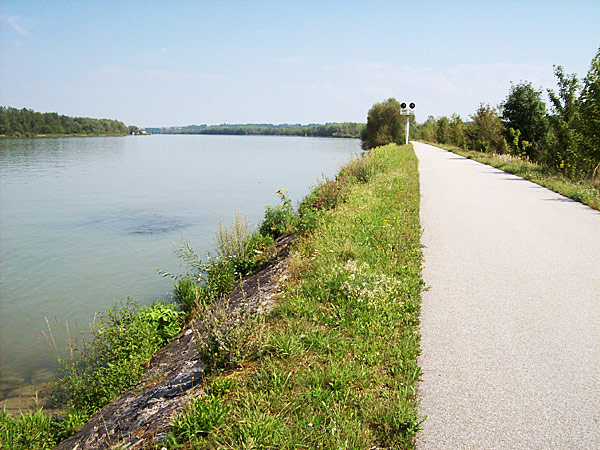 Der typische unspannende Verlauf des Weges auf dem Deich der Donau. Für uns als Mittelgebirgsfahrer mit gewisser Transalp-Erfahrung waren solche endlos asphaltierten Kilometerfresser-Strecken schon etwas gewöhnungsbedürftig. Mit unseren profillosen Reifen, die extra für die Tour angeschafft wurden, waren die 120-170 Kilometer pro Tag keine all zu große Herausforderung.